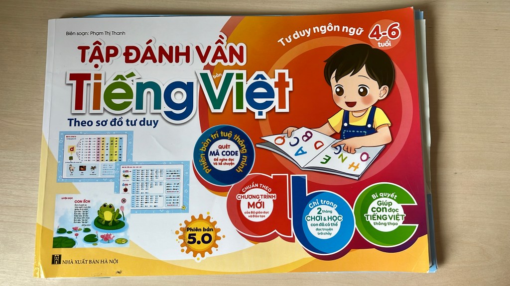 Quyển sách mình đang sử dụng để dạy con tập đọc tên là “Tập đánh vần tiếng Việt” (biên soạn Phạm Thị Thanh, NXB Hà Nội), các bạn thấy có nham nhở không. Đó là vì một lần bé khóc lóc ăn vạ, biết mình quý sách nên xé để cho mình giận lên. Nói chung công cuộc giáo dục ở nhà mình cũng lắm gian nan. 🙂