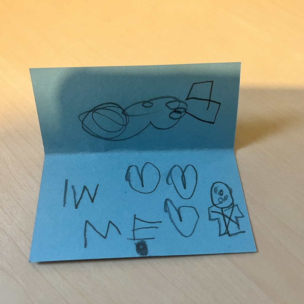 Bé làm thiệp ghi “Iw mẹ” ở nhà trẻ cho mình. Chữ mẹ thì biết viết, còn chữ “iw” thì tự chế. 🙂