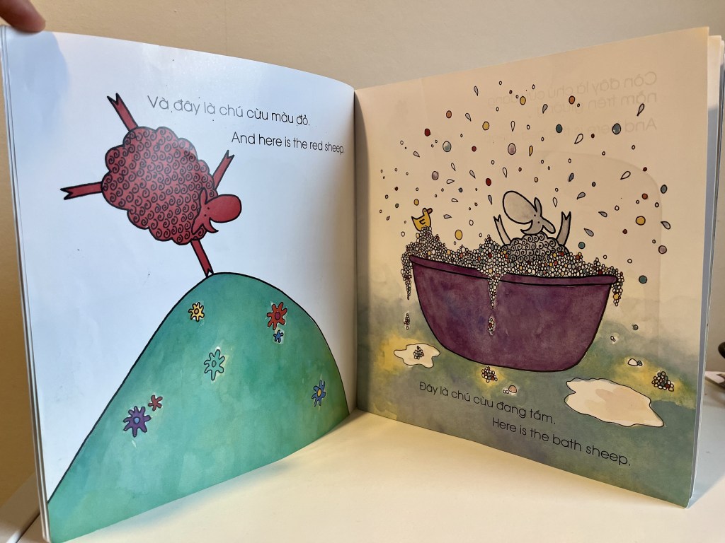 Quyển này cũng tương tự, lặp đi lặp lại “Đây là chú cừu…”, cho nên sau mấy lần như vậy thì bé nhà mình thấy những chữ này thì phản xạ nhanh hơn. Ngoài ra, sách có nhiều hình ảnh minh hoạ nên bé được gợi ý, ví dụ, trong trang này bé đọc “Đây là chú cừu đang…”, sau đó hình ảnh đã gợi cho bé “tắm”, sau đó mình hướng dẫn bé đánh vần chữ này nữa là xong. Đây là ưu điểm vượt trội so với việc đọc một câu trong sách đánh vần như “Bố Trà có cá trê to” rất xa lạ, khó nhớ.