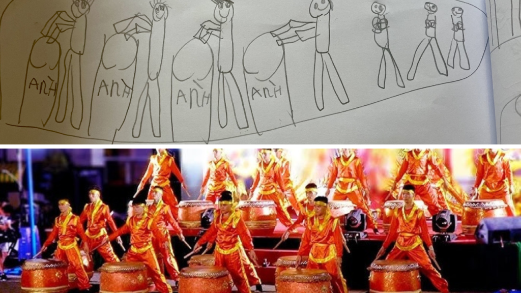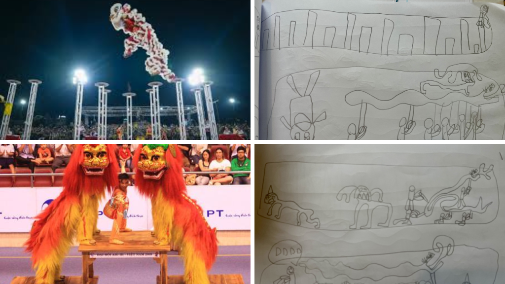 Hết tự múa, xem múa thì lại vẽ. Đây, vẽ đội trống lân, vẽ múa lân, múa sư quanh quả cầu, múa rồng. Tất cả đều là nhớ lại mà vẽ, mình do xem quá nhiều video múa mà cũng phân biệt được ngay cái nào nó vẽ múa sư, cái nào múa lân Mai Hoa Thung. Những bức tranh non nớt này cũng chính là minh chứng là con yêu thích, con cảm được, con mơ tưởng về một phần bản sắc văn hoá của mình.