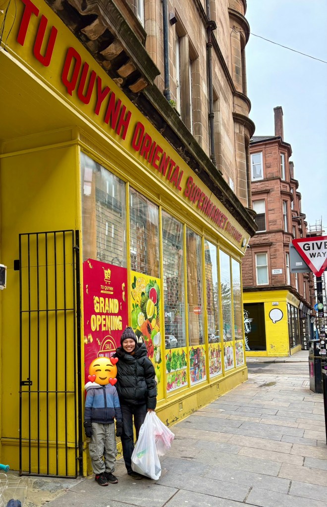Vào cửa hàng một cái là, mẹ ơi bánh chưng kìa, chân gà kìa, mẹ ơi toàn người Việt Nam! Xong rồi đứng đắm đuối ở kệ đồ ăn vặt, vừa nhìn hình vừa cố gắng đánh vần xem đấy là món gì. Xong ngẩn ra một tí rồi reo lên, mẹ ơi đang mở bài “Đường về nhà” kìa! Mình lắng nghe thì đúng thật, con nghe ra được bài hát tủ thì sướng quá, lẩm nhẩm hát theo, về nhà còn đòi mở đi mở lại. Chỉ một chuyện nhỏ như thế mà truyền cho con cảm hứng lâu dài để học đọc tiếng Việt, để hát và nghe nhạc Việt. Đây hai mẹ con mình với hai túi chiến lợi phẩm: