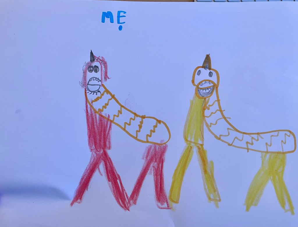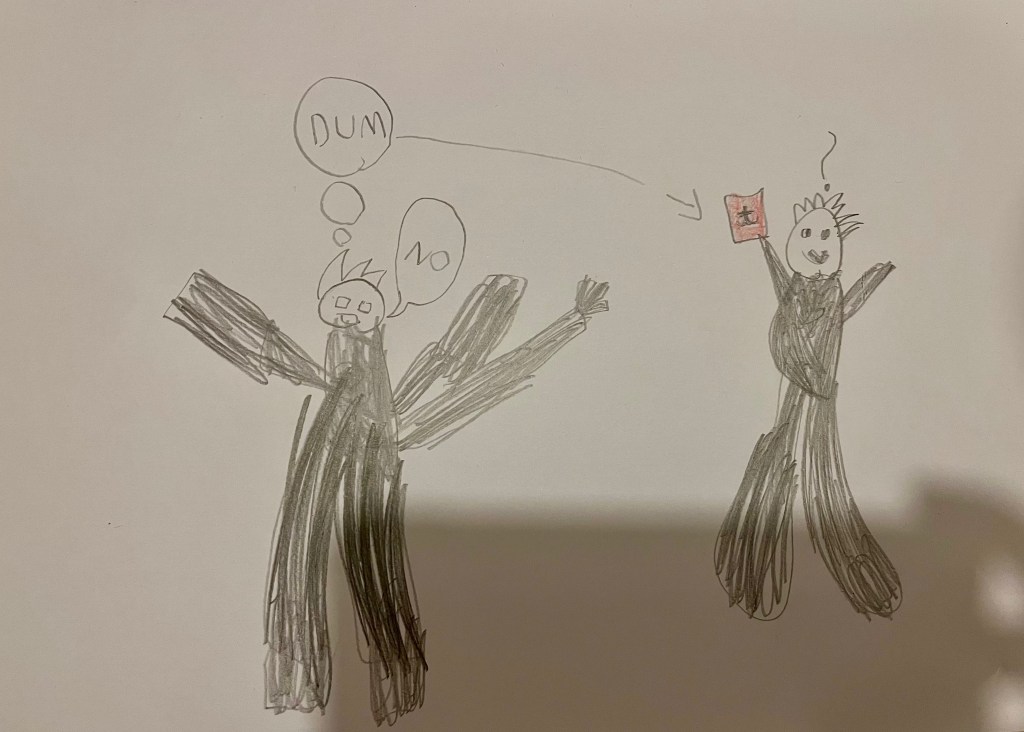 Hoặc một hôm cu cậu ngồi hí hoáy vẽ, sau đó đố mình: đố mẹ đây là hình minh hoạ cho bài hát nào. Mình còn đang bối rối, thì cu cậu giải thích luôn: Đây là ba, còn đây là Đôn, mà mẹ thấy chân dài chưa, có nghĩa là lớn rồi, 16 tuổi rồi. Ba đang cố gắng đưa lì xì cho Đôn mà Đôn nói “No”. He he, đó là bài hát “Nhưng bé lớn rồi bé không thích lì xì.” Mình phá ra cười, đồng thời cũng nhận ra, con không chỉ hát, mà con nhớ, con nghĩ về nó, con vẽ minh hoạ cho nó luôn.