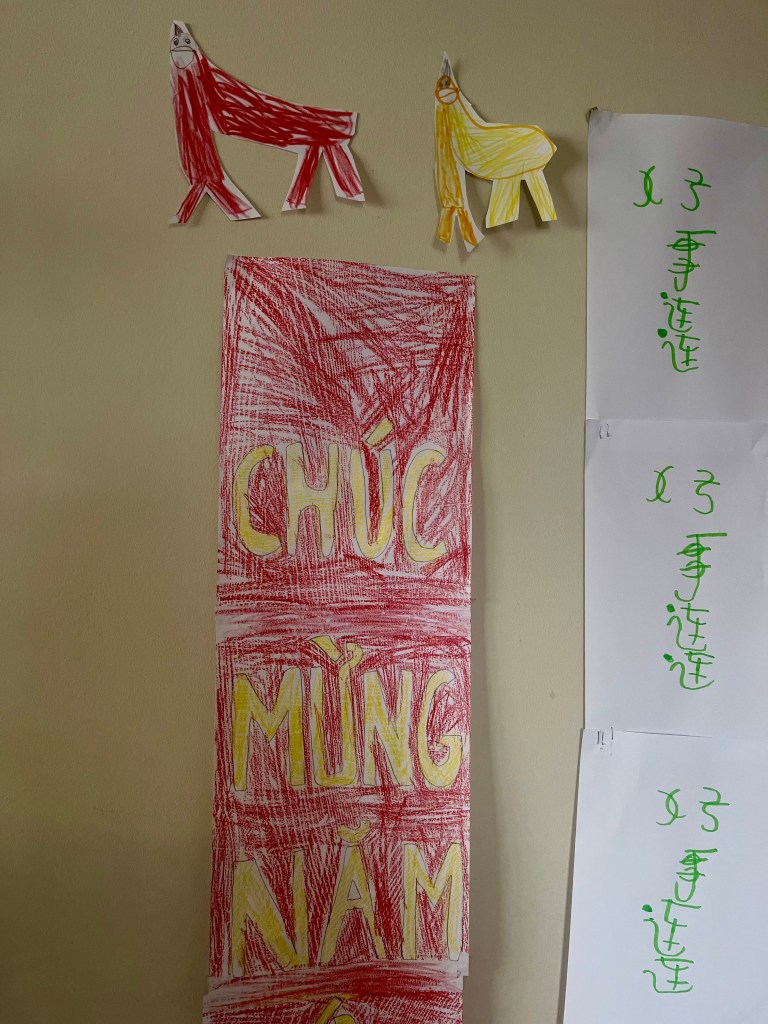Giáng Sinh có nhiều biểu tượng: người tuyết, ông già Noel, cây kẹo hai màu trắng đỏ, vòng nguyệt quế, bông tuyết… Tết cũng thế, và bức tường Tết mà con làm, dù vụng về, non nớt, cho mình thấy những biểu tượng của Tết đã in sâu trong tâm trí con, là một phần bản sắc văn hoá của con. Mình rất cảm động và tự hào.