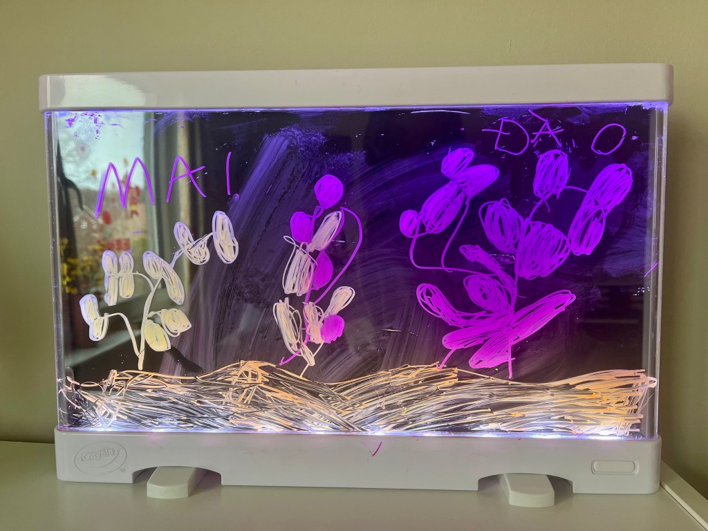 Con vẽ hoa mai và hoa đào lên bảng vẽ LED, bật đèn trang trí cho đẹp, viết chữ “mai”, “đào”, mình còn nghe con giảng giải cho ba hoa nào là hoa nào, hoa nào ở miền Nam, hoa nào ở miền Bắc nữa.