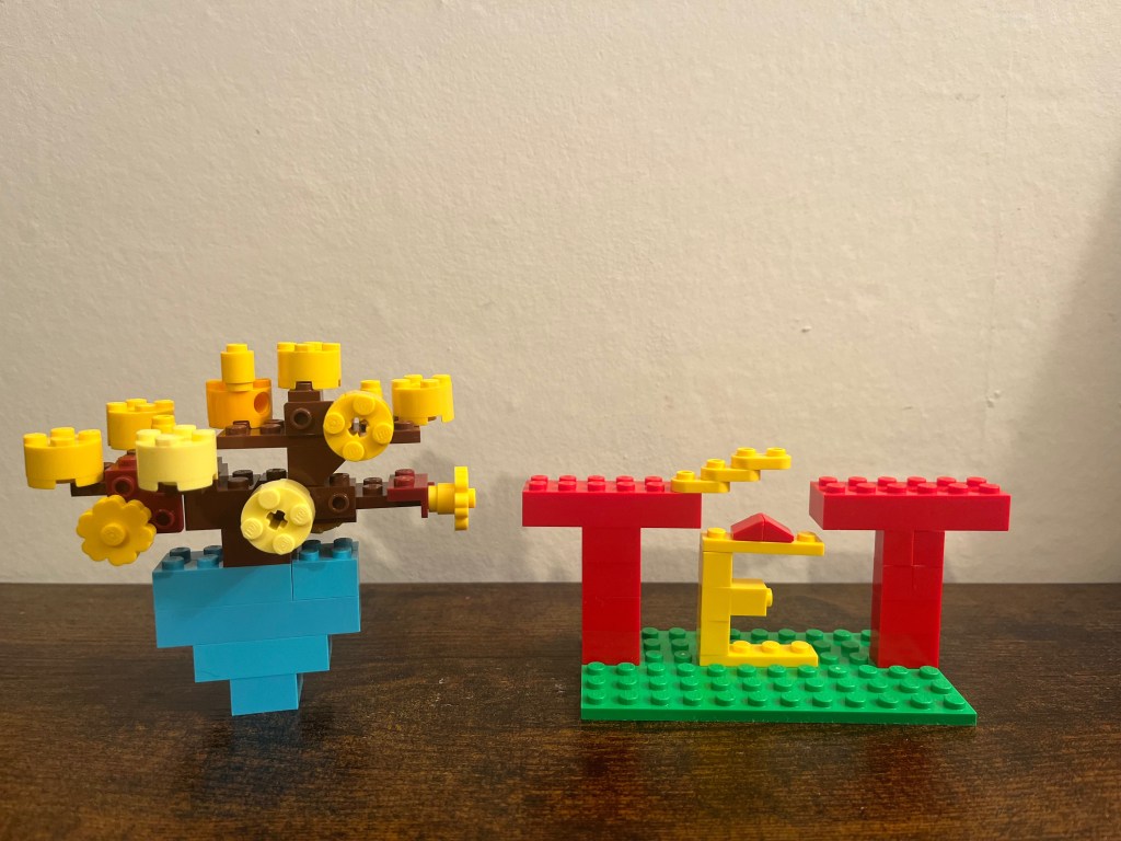 Con rủ mình làm lego chữ Tết, làm chậu mai, làm con lân để lên kệ.